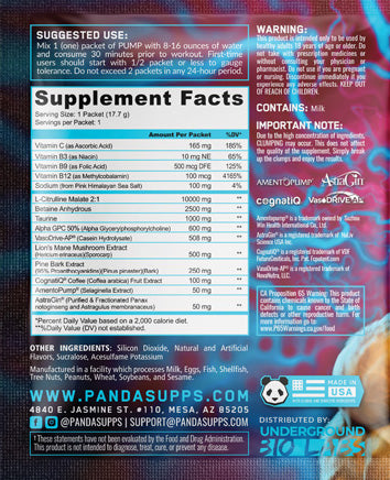 Panda Pump comes with 10g of citrulline malate, at a 2:1 citrulline to malic acid ratio, 2.5g of betaine. 508 MG of VasoDrive AP, pine bark, premium AmentoPump™, Gram of taurine & 50mg of AstraGin. Panda Pump is also packed with half a gram of the nootropic mushroom lion’s mane, 100mg of CognatiQ, and an effective 600mg of alpha-GPC. This PRE will Elevate your Workout and Performance to another level!