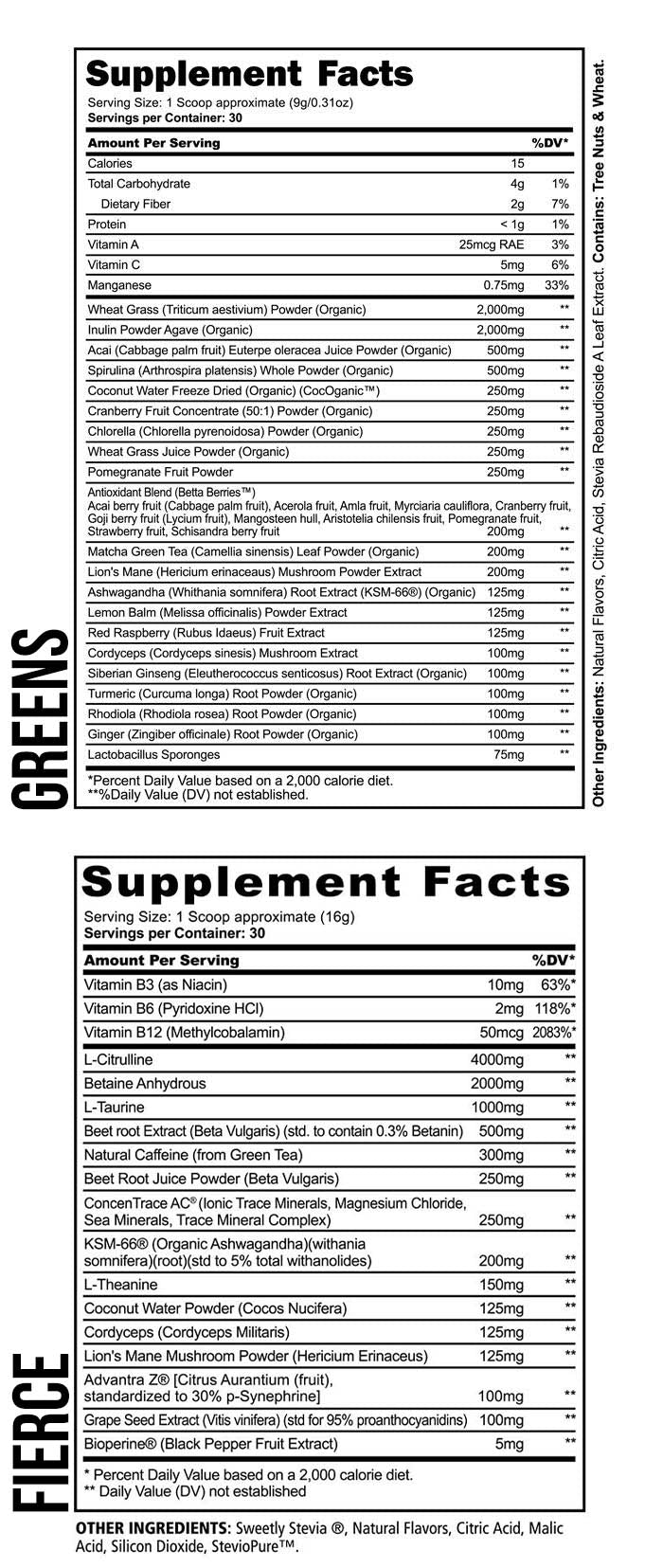 Mix 1 scoop of NATURAL GREENS with 8-16 ounces of water or your favorite milk or smoothie. Enjoy once or twice a day. Do not exceed 2 scoops per day. Mix 1 scoop of NATURAL FIERCE with 4-8 ounces of water. Consume 15-30 minutes prior to training.