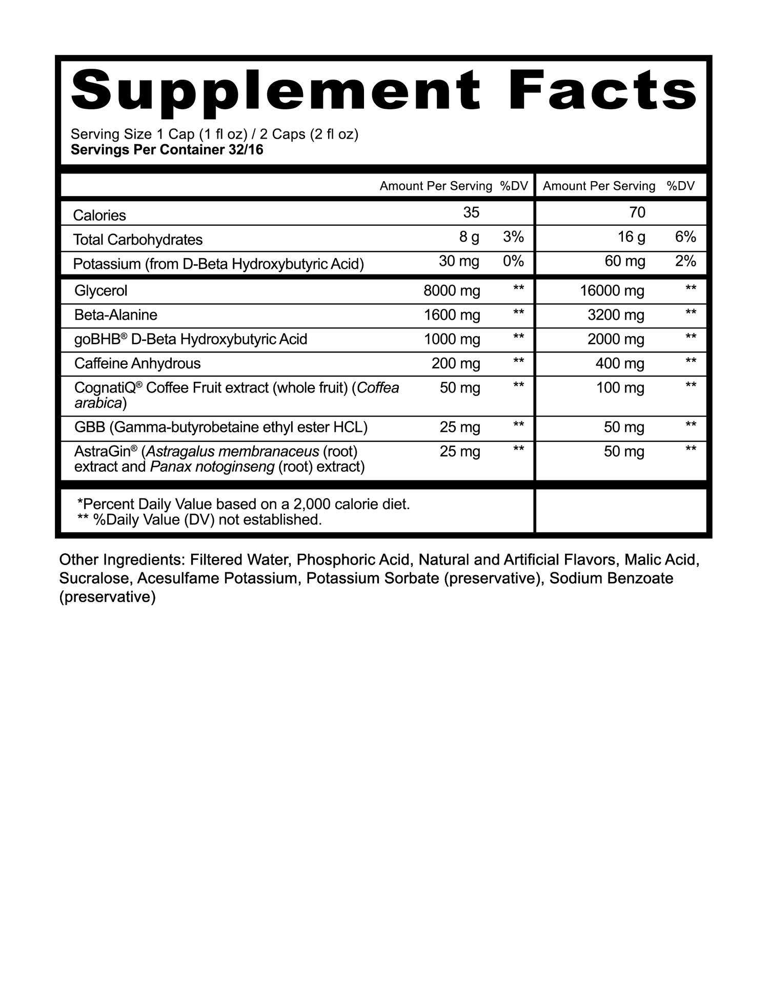 SUGGESTED USE: Take 1-2 caps 15-20 minutes prior to workout. DO NOT exceed 2 capfuls in 24 hours. Start with 1⁄2 capful (1 tbsp) to assess tolerance. Refrigerate for optimal taste but not required.